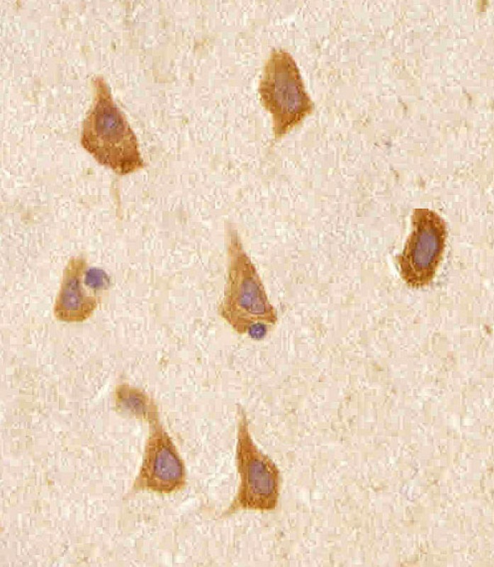 APR03713G staining PREX1 in human brain tissue sections by Immunohistochemistry (IHC-P - paraformaldehyde-fixed, paraffin-embedded sections). Tissue was fixed with formaldehyde and blocked with 3% BSA for 0. 5 hour at room temperature; antigen retrieval was by heat mediation with a citrate buffer (pH6). Samples were incubated with primary antibody (1/25) for 1 hours at 37°C. A undiluted biotinylated goat polyvalent antibody was used as the secondary antibody.