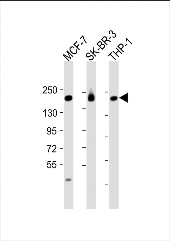 All lanes : Anti-PREX1 Antibody (C-term) at 1:2000 dilution Lane 1: MCF-7 whole cell lysate Lane 2: SK-BR-3 whole cell lysate Lane 3: THP-1 whole cell lysate Lysates/proteins at 20 μg per lane. Secondary Goat Anti-Rabbit IgG, (H+L), Peroxidase conjugated at 1/10000 dilution. Predicted band size : 186 kDa Blocking/Dilution buffer: 5% NFDM/TBST.
