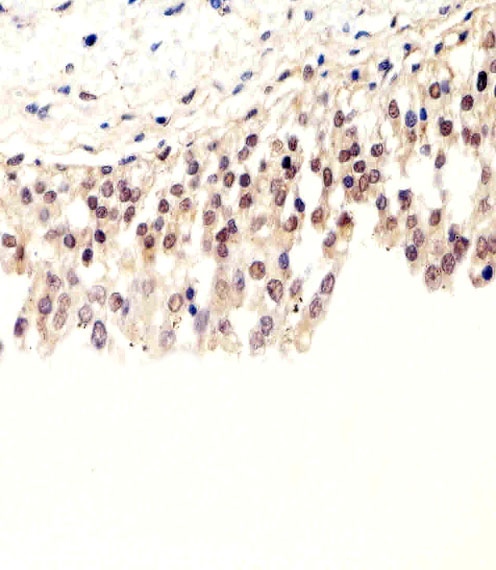 Immunohistochemical analysis of paraffin-embedded H.bladder section using Pan SUMO Antibody( APR03755G). APR03755G was diluted at 1:100 dilution. A peroxidase-conjugated goat anti-rabbit IgG at 1:400 dilution was used as the secondary antibody, followed by DAB staining.