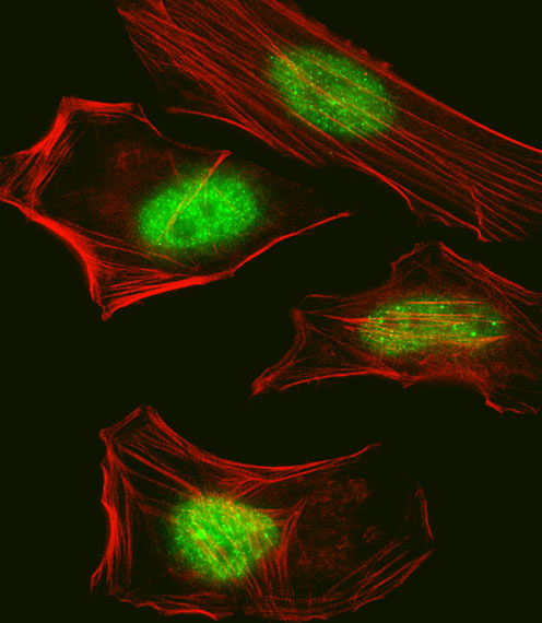 Fluorescent confocal image of Hela cell stained with Pan SUMO Antibody( APR03755G).Hela cells were fixed with 4% PFA (20 min), permeabilized with Triton X-100 (0.1%, 10 min), then incubated with Pan SUMO primary antibody (1:25, 1 h at 37℃). For secondary antibody, Alexa Fluor? 488 conjugated donkey anti-rabbit antibody (green) was used (1:400, 50 min at 37℃).Cytoplasmic actin was counterstained with Alexa Fluor? 555 (red) conjugated Phalloidin (7units/ml, 1 h at 37℃). Nuclei were counterstained with DAPI (blue) (10 μg/ml, 10 min).Pan SUMO immunoreactivity is localized to Nucleus significantly.