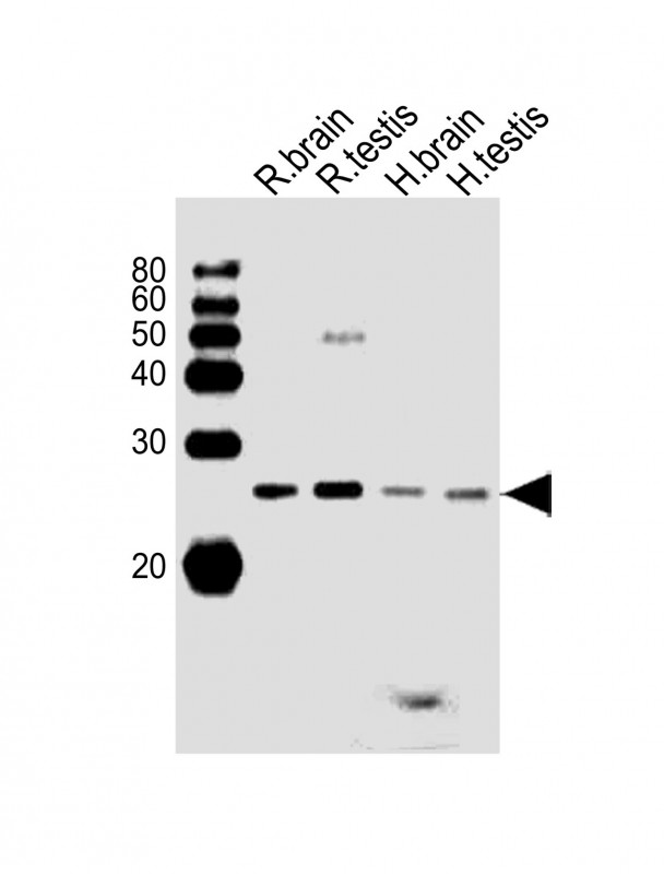 All lanes : Anti-(RAT) Rab11b Antibody (C-term) at 1:1000 dilution Lane 1: rat brain lysates Lane 2: rat testis lysates Lane 3: human brain lysates Lane 4: human testis lysates Lysates/proteins at 20 μg per lane. Secondary Goat Anti-Rabbit IgG, (H+L), Peroxidase conjugated at 1/10000 dilution Predicted band size : 24 kDa Blocking/Dilution buffer: 5% NFDM/TBST.