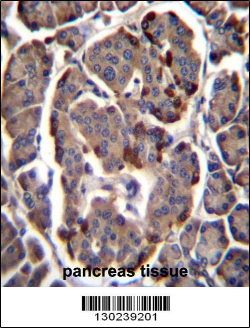 RAB11B Antibody (C-term) (Cat. APR03759G)immunohistochemistry analysis in formalin fixed and paraffin embedded human pancreas tissue followed by peroxidase conjugation of the secondary antibody and DAB staining.This data demonstrates the use of RAB11B Antibody (C-term) for immunohistochemistry. Clinical relevance has not been evaluated. |