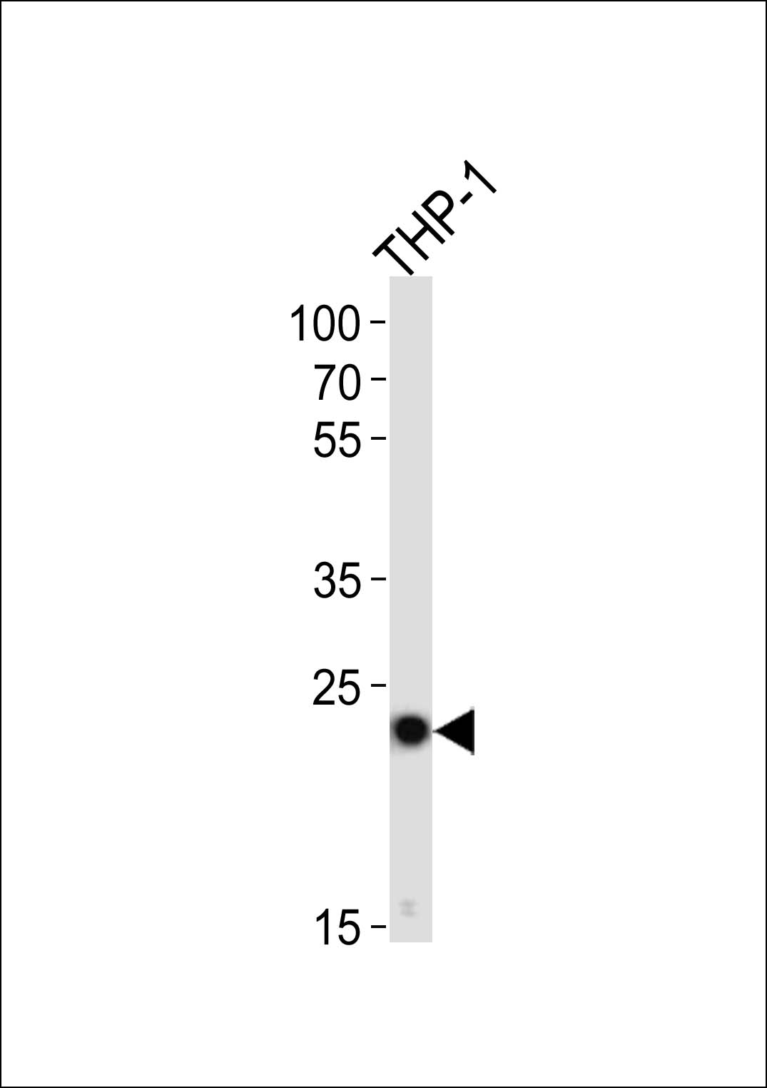 Western blot analysis of lysate from THP-1 cell line, using PYCARD Antibody (C-term)(APR03879G). APR03879G was diluted at 1:1000. A goat anti-rabbit IgG H&L(HRP) at 1:10000 dilution was used as the secondary antibody. Lysate at 20ug.