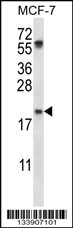 PYCARD Antibody (C-term) (Cat. APR03879G) western blot analysis in MCF-7 cell line lysates (35ug/lane).This demonstrates the PYCARD antibody detected the PYCARD protein (arrow). |