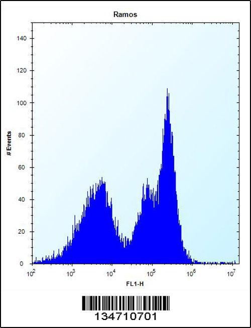 ZAP70 Antibody (Center) (Cat. APR03917G) flow cytometric analysis of Ramos cells (right histogram) compared to a negative control cell (left histogram).FITC-conjugated donkey-anti-rabbit secondary antibodies were used for the analysis.