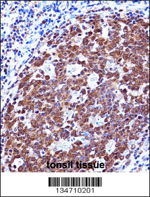 ZAP70 Antibody (Center) (APR03917G)immunohistochemistry analysis in formalin fixed and paraffin embedded human tonsil tissue followed by peroxidase conjugation of the secondary antibody and DAB staining.This data demonstrates the use of ZAP70 Antibody (Center) for immunohistochemistry. Clinical relevance has not been evaluated. |