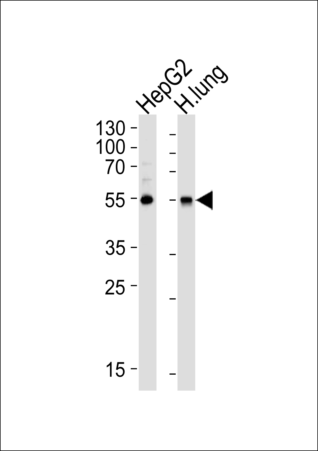 Western blot analysis of lysates from HepG2 cell line and human lung tissue lysate (from left to right), using ALDH1A1 Antibody(APR03991G). APR03991G was diluted at 1:1000 at each lane. A goat anti-rabbit IgG H&L(HRP) at 1:5000 dilution was used as the secondary antibody. Lysates at 35ug per lane.