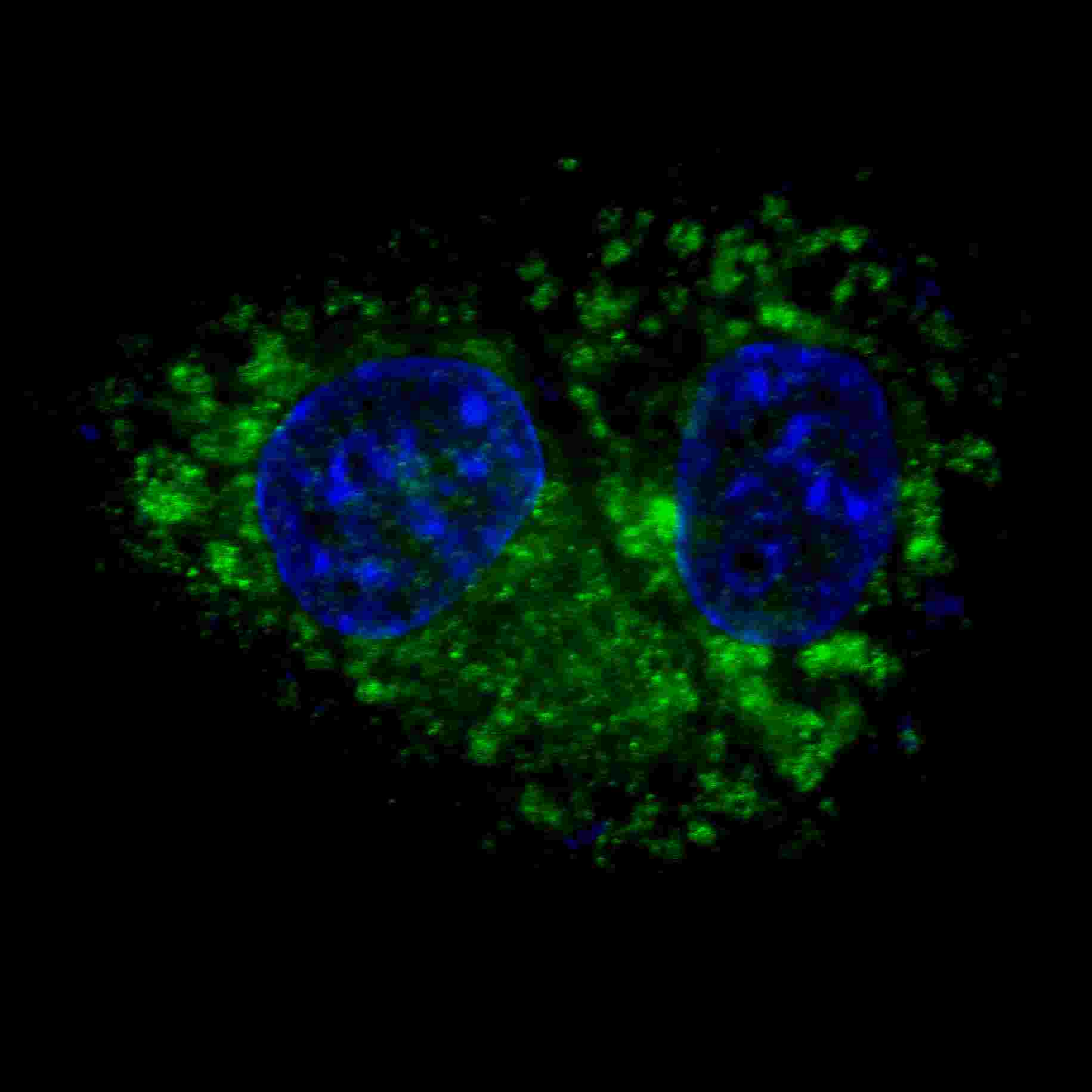 Fluorescent confocal image of HepG2 cells stained with ALDH1A1 antibody. HepG2 cells were fixed with 4% PFA (20 min), permeabilized with Triton X-100 (0.2%, 30 min). Cells were then incubated with APR03991G ALDH1A1 primary antibody (1:100, 2 h at room temperature). For secondary antibody, Alexa Fluor? 488 conjugated donkey anti-rabbit antibody (green) was used (1:1000, 1h). Nuclei were counterstained with Hoechst 33342 (blue) (10 μg/ml, 5 min). ALDH1A1 immunoreactivity is localized to the cytoplasm of HepG2 cells.