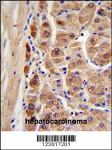 ALDH1A1 Antibody (Cat. APR03991G) IHC analysis in formalin fixed and paraffin embedded human hepatocarcinoma followed by peroxidase conjugation of the secondary antibody and DAB staining. This data demonstrates the use of the ALDH1A1 Antibody for immunohistochemistry. Clinical relevance has not been evaluated. |