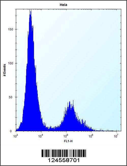 VDR Antibody (Center) (Cat. APR04015G) flow cytometric analysis of Hela cells (right histogram) compared to a negative control cell (left histogram).FITC-conjugated donkey-anti-rabbit secondary antibodies were used for the analysis. |