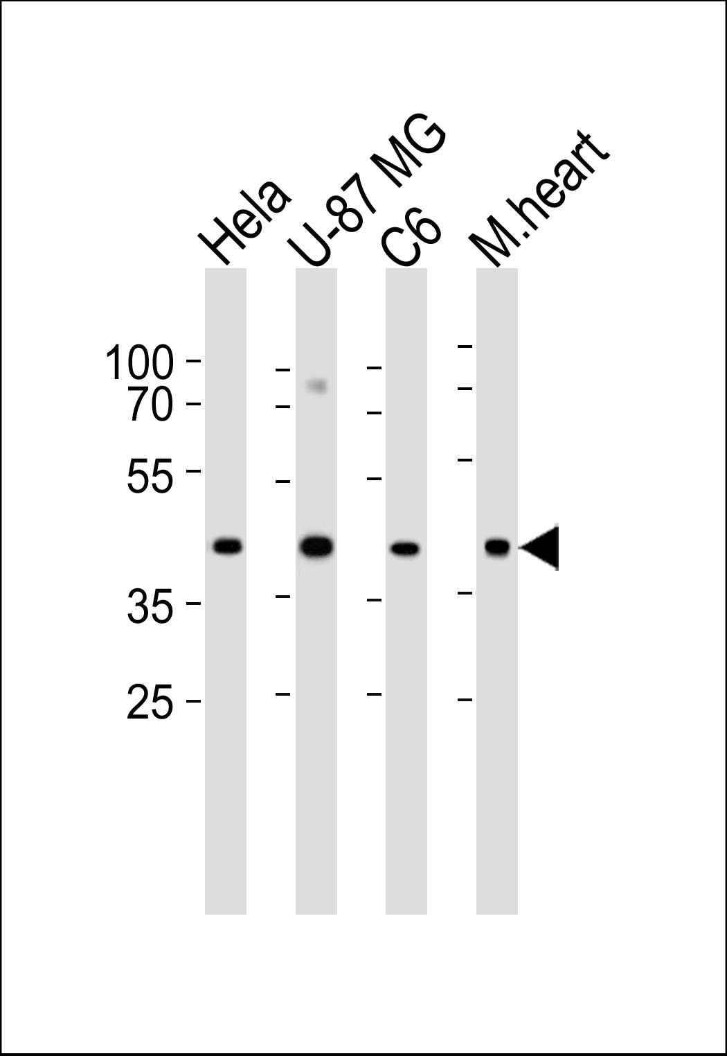 Western blot analysis of lysates from Hela, U-87 MG, C6 cell line and mouse heart tissue lysate (from left to right), using GJA1 Antibody (N121)(APR04054G). APR04054G was diluted at 1:1000 at each lane. A goat anti-rabbit IgG H&L(HRP) at 1:5000 dilution was used as the secondary antibody. Lysates at 35ug per lane.