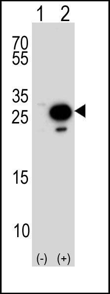 Western blot analysis of TPT1 Antibody (N-term) (arrow) using rabbit polyclonal TPT1 Antibody (N-term) (APR04284G). 293 cell lysates (2 ug/lane) either nontransfected (Lane 1) or transiently transfected (Lane 2) with the TPT1 gene. A goat anti-rabbit IgG H&L(HRP) at 1:5000 dilution was used as the secondary antibody. |