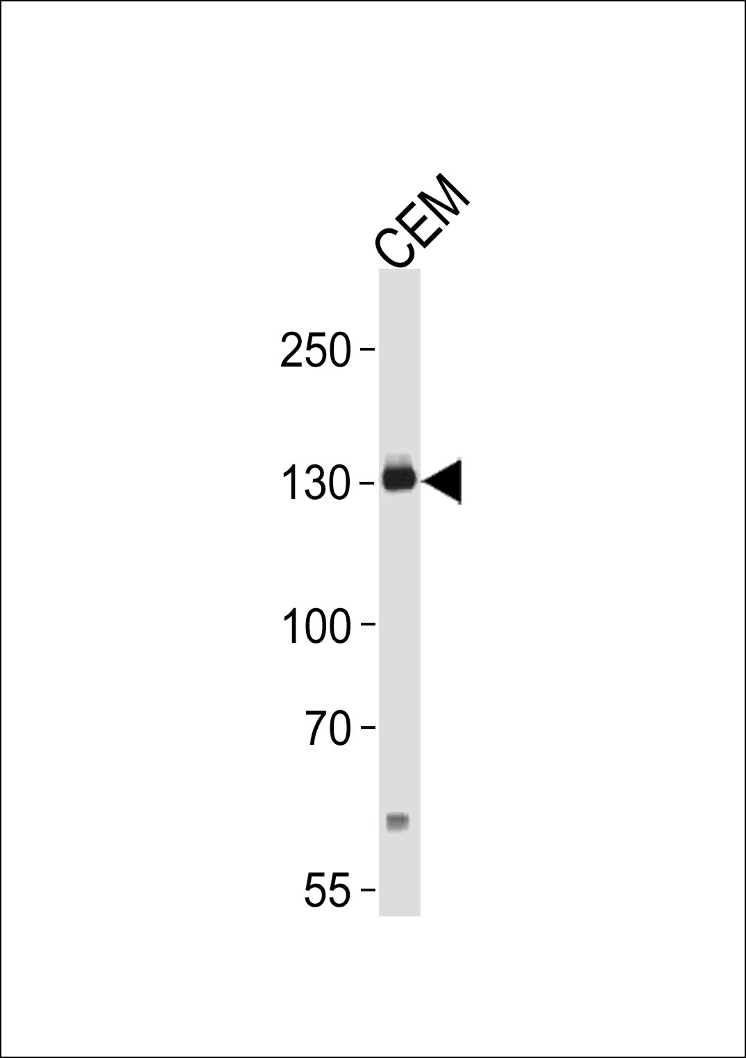 ERBB2 Antibody (T1172/S1174) (Cat. APR04371G) western blot analysis in CEM cell line lysates (35ug/lane).This demonstrates the ERBB2 antibody detected the ERBB2 protein (arrow). |