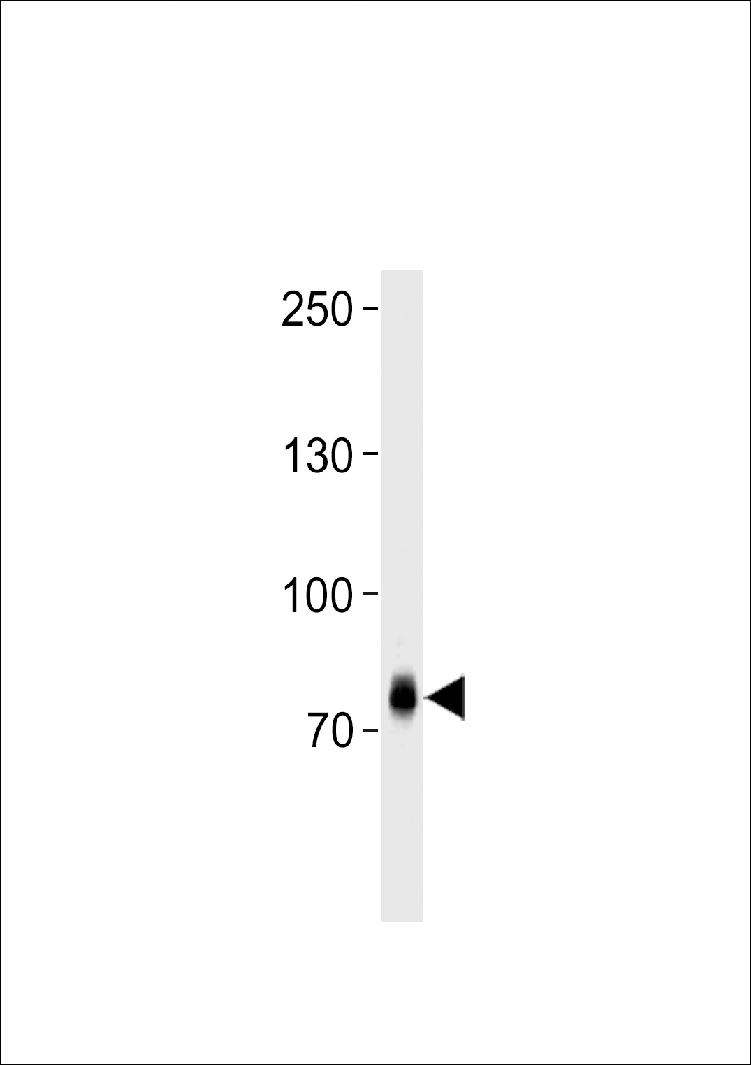 ZNF219 Antibody (C-term) (Cat. APR04477G) western blot analysis in CEM cell line lysates (35ug/lane).This demonstrates the ZNF219 antibody detected the ZNF219 protein (arrow). |