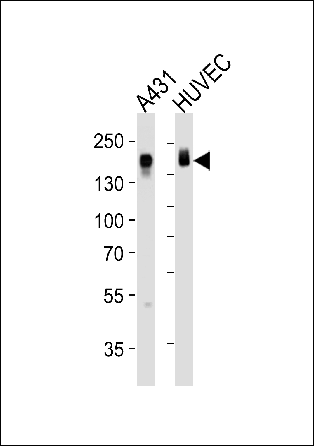 Western blot analysis of lysates from A431, HUVEC cell line (from left to right), using EGFR Antibody (N-term) (APR04478G). APR04478G was diluted at 1:1000 at each lane. A goat anti-rabbit IgG H&L (HRP) at 1:5000 dilution was used as the secondary antibody. Lysates at 35ug per lane. |