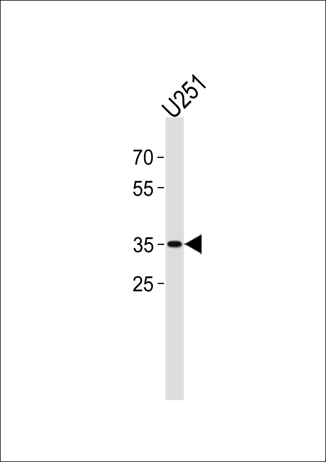 JUN Antibody (C-term) (Cat. APR04481G) western blot analysis in U251 cell line lysates (35ug/lane).This demonstrates the JUN antibody detected the JUN protein (arrow).