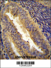 JUN Antibody (C-term) (Cat. AP1984I) immunohistochemistry analysis in formalin fixed and paraffin embedded human uterus tissue followed by peroxidase conjugation of the secondary antibody and DAB staining.This data demonstrates the use of JUN Antibody (C-term) for immunohistochemistry. Clinical relevance has not been evaluated.