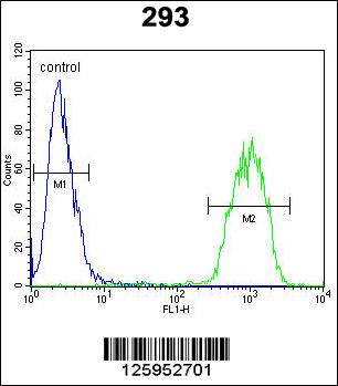 JUN Antibody (C-term) (Cat. APR04481G) flow cytometric analysis of 293 cells (right histogram) compared to a negative control cell (left histogram).FITC-conjugated goat-anti-rabbit secondary antibodies were used for the analysis. |