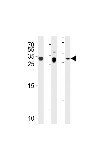 p27Kip1 Antibody (N-term S12) (Cat. APR04504G) western blot analysis in A431,Hela,mouse C2C12 cell line lysates (35ug/lane).This demonstrates the p27Kip1 antibody detected the p27Kip1 protein (arrow). |