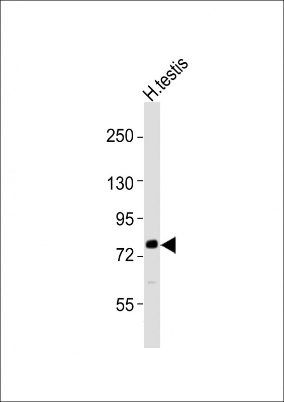 Western blot analysis of CUL4B Antibody (Center) Pab (Cat. APR04534G) pre-incubated without(lane 1) and with(lane 2) blocking peptide in Hela cell line lysate. CUL4B Antibody (Center) (arrow) was detected using the purified Pab. |