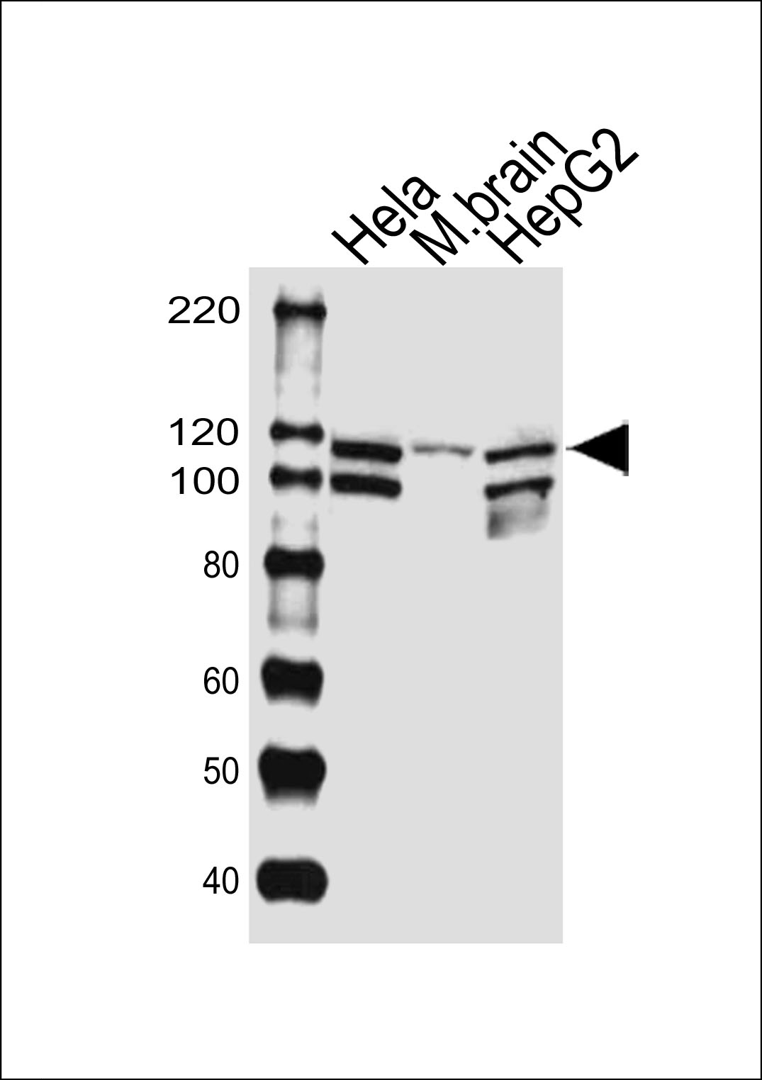 Western blot analysis of lysates from Hela cell line, mouse brain tissue lysate, HepG2 cell line (from left to right), using UBE3CAntibody(Center)(APR04583G). APR04583G was diluted at 1:1000 at each lane. A goat anti-rabbit IgG H&L(HRP) at 1:10000 dilution was used as the secondary antibody. Lysates at 20ug per lane.