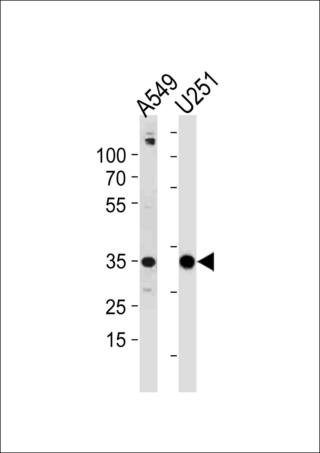 ASB9 Antibody (N-term) (Cat. APR04588G) western blot analysis in A549,U251 cell line lysates (35ug/lane).This demonstrates the ASB9 antibody detected the ASB9 protein (arrow). |