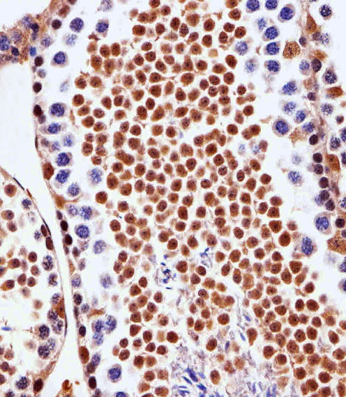 Immunohistochemical analysis of paraffin-embedded M.testis section using PSMD10 Antibody (Center)( APR04620G). APR04620G was diluted at 1:25 dilution. A peroxidase-conjugated goat anti-rabbit IgG at 1:400 dilution was used as the secondary antibody, followed by DAB staining.