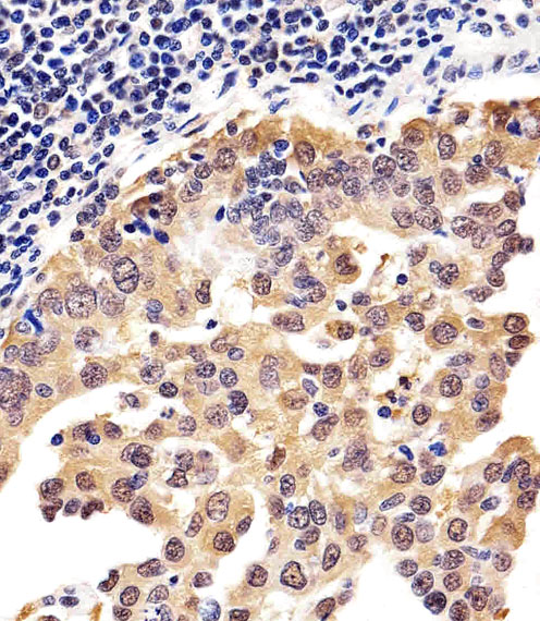Immunohistochemical analysis of paraffin-embedded H.lung adenocarcinoma section using PSMD10 Antibody (Center)( APR04620G). APR04620G was diluted at 1:25 dilution. A peroxidase-conjugated goat anti-rabbit IgG at 1:400 dilution was used as the secondary antibody, followed by DAB staining. |