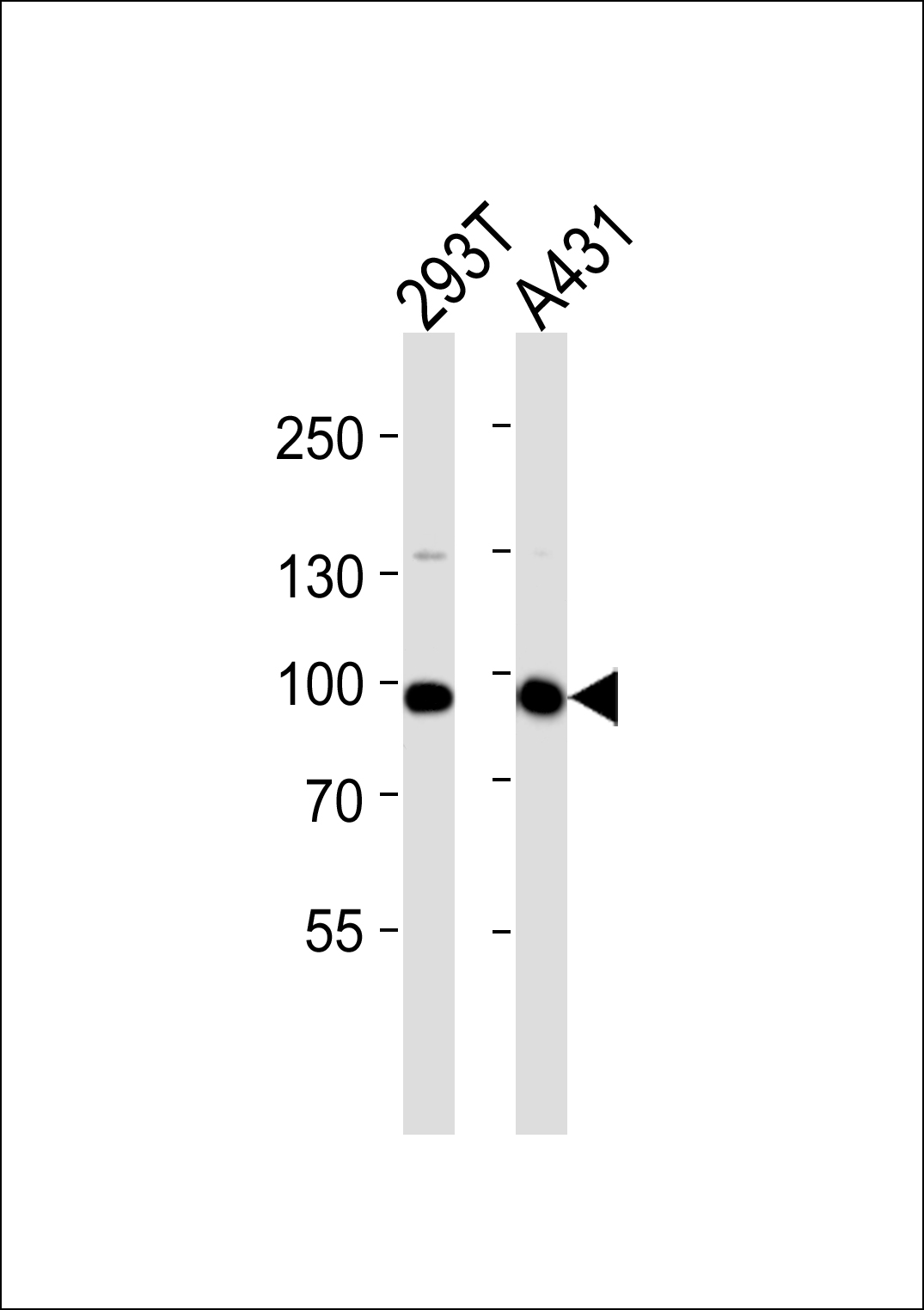 Western blot analysis of lysates from 293T, A431 cell line (from left to right), using IL4R Antibody (C-term)(APR04621G). APR04621G was diluted at 1:1000 at each lane. A goat anti-rabbit IgG H&L(HRP) at 1:5000 dilution was used as the secondary antibody. Lysates at 35ug per lane. |