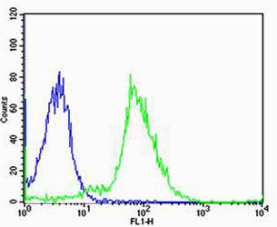 Flow cytometric analysis of MCF-7 cells using GADD45GIP1 Antibody (N-term)(green, APR04627G) compared to an isotype control of rabbit IgG(blue). APR04627G was diluted at 1:25 dilution. An Alexa Fluor? 488 goat anti-rabbit lgG at 1:400 dilution was used as the secondary antibody.
