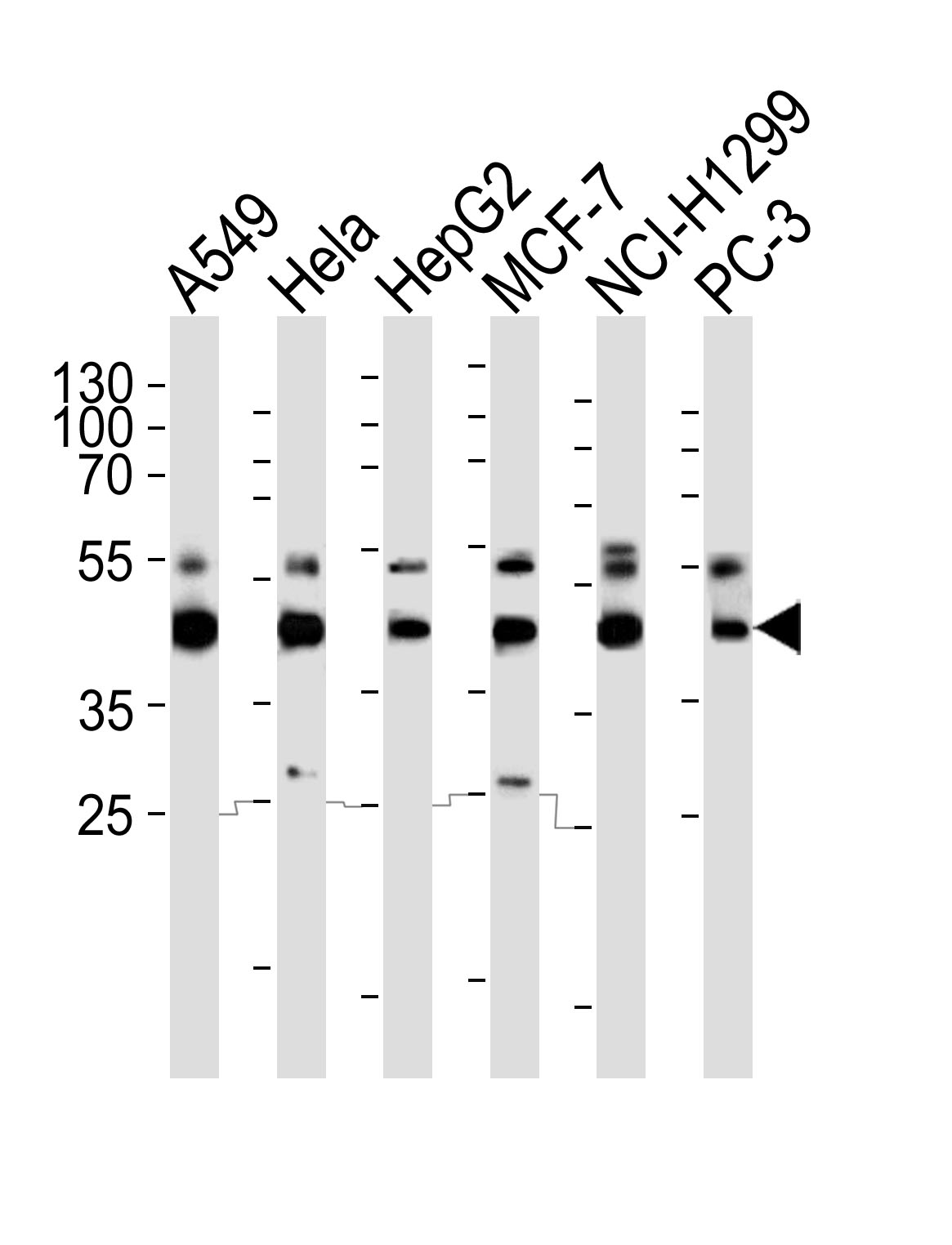 Western blot analysis of lysates from A549, Hela, HepG2, MCF-7, NCI-H1299, PC-3 cell line (from left to right), using INHBA Antibody (C-term)(APR04636G). APR04636G was diluted at 1:1000 at each lane. A goat anti-rabbit IgG H&L(HRP) at 1:5000 dilution was used as the secondary antibody. Lysates at 35ug per lane. |