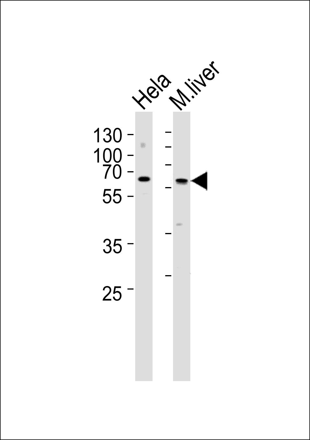 Western blot analysis of lysates from Hela cell line and mouse liver tissue lysate(from left to right), using Sqstm1(S351) Antibody APR04661G). APR04661G was diluted at 1:1000 at each lane. A goat anti-rabbit IgG H&L(HRP) at 1:5000 dilution was used as the secondary antibody. Lysates at 35ug per lane. |