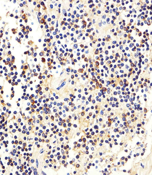 Immunohistochemical analysis of paraffin-embedded H. spleen section using MME Antibody (N-term)( APR04665G). APR04665G was diluted at 1:25 dilution. A peroxidase-conjugated goat anti-rabbit IgG at 1:400 dilution was used as the secondary antibody, followed by DAB staining.