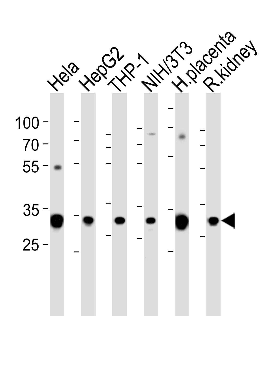 Western blot analysis of lysates from Hela, HepG2, THP-1, mouse NIH/3T3 cell line , human placenta and rat kidney tissue lysate(from left to right), using ANXA5 Antibody (Center)(APR04677G). APR04677G was diluted at 1:1000 at each lane. A goat anti-rabbit IgG H&L(HRP) at 1:5000 dilution was used as the secondary antibody. Lysates at 35ug per lane. |