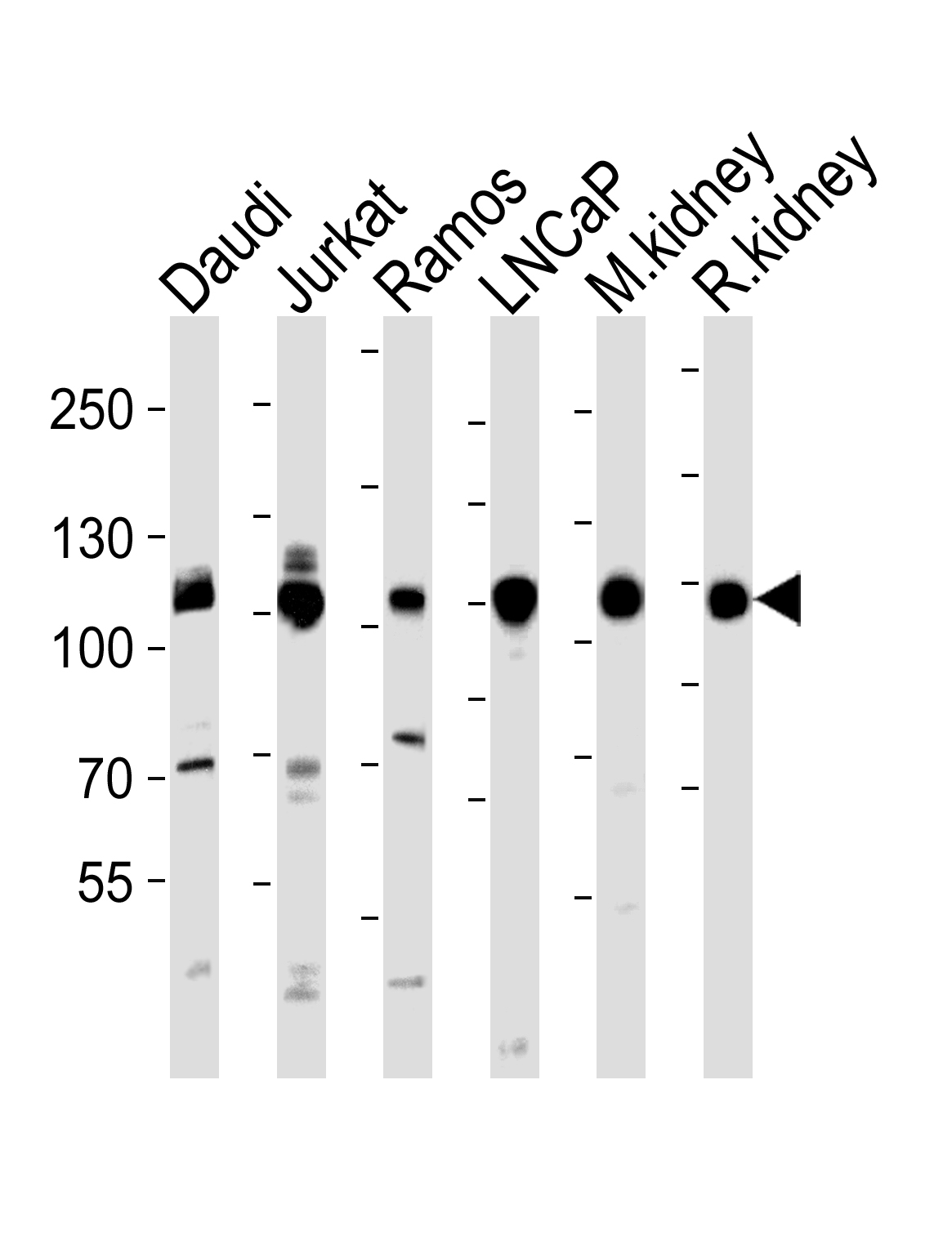 Western blot analysis of lysates from Daudi, Jurkat, Ramos, LNCaP cell line, mouse kidney, rat kidney tissue lysate(from left to right), using MME Antibody (Center)(APR04681G). APR04681G was diluted at 1:1000 at each lane. A goat anti-rabbit IgG H&L(HRP) at 1:5000 dilution was used as the secondary antibody. Lysates at 35ug per lane. |