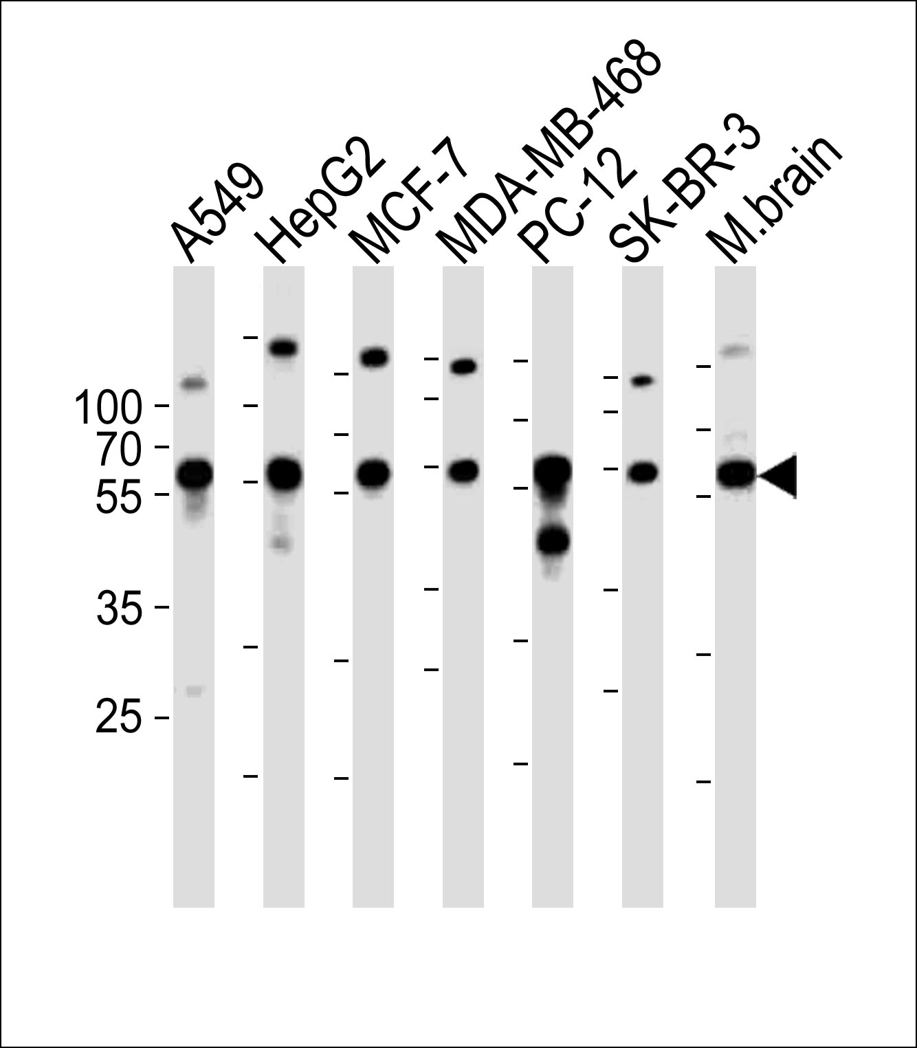 Western blot analysis of lysates from A549, HepG2, MCF-7, MDA-MB-468, rat PC-12, SK-BR-3 cell line and mouse brain tissue lysate(from left to right), using SERBP1 Antibody (Center)(APR04693G). APR04693G was diluted at 1:1000 at each lane. A goat anti-rabbit IgG H&L(HRP) at 1:10000 dilution was used as the secondary antibody. Lysates at 35ug per lane. |