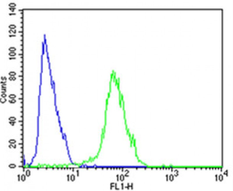 Flow cytometric analysis of SH-SY5Y cells using FGFR1 Antibody (Center)(green, APR04737G) compared to an isotype control of rabbit IgG(blue). APR04737G was diluted at 1:25 dilution. An Alexa Fluor? 488 goat anti-rabbit lgG at 1:400 dilution was used as the secondary antibody.