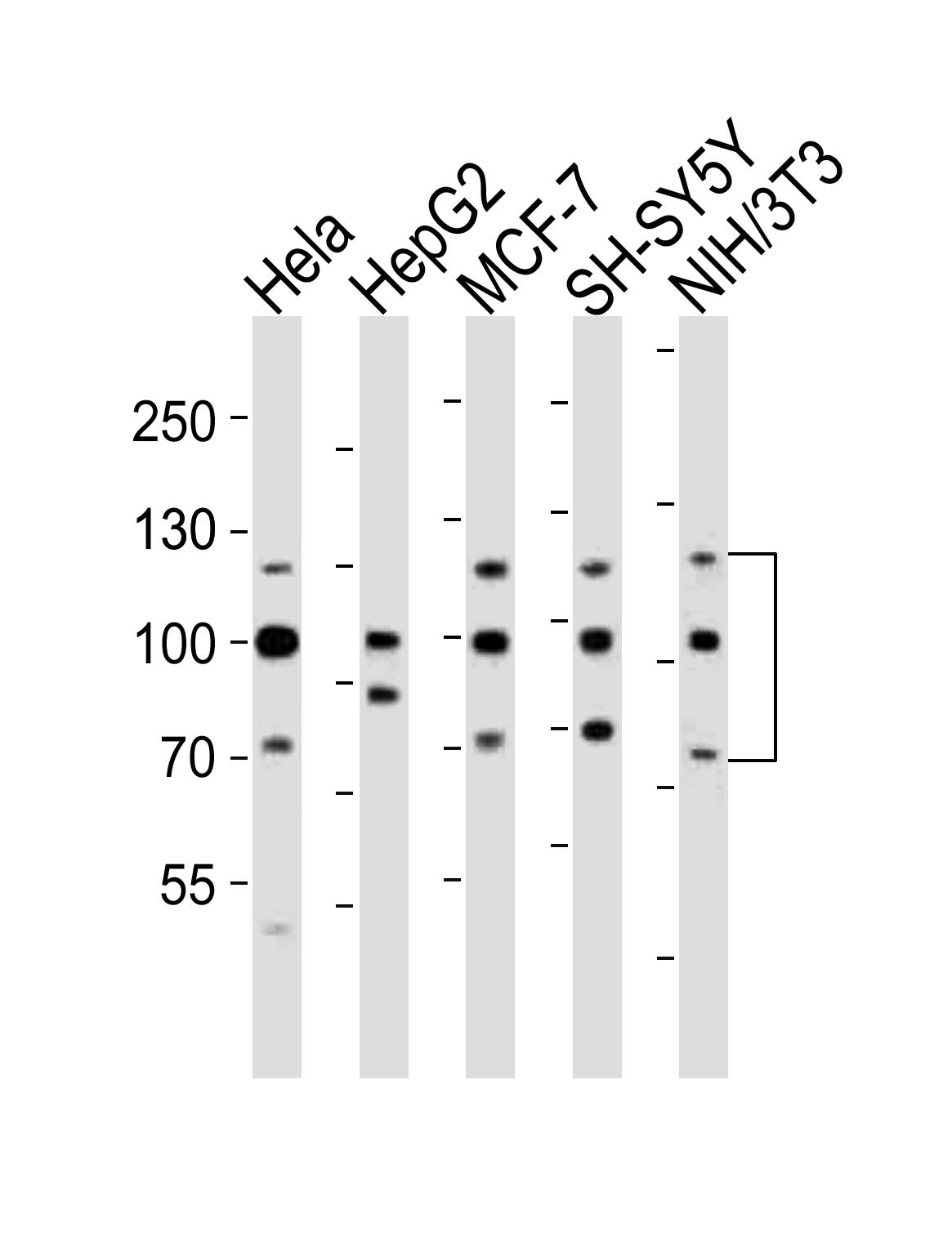 Western blot analysis of lysates from Hela, HepG2, MCF-7, SH-SY5Y, mouse NIH/3T3 cell line (from left to right), using FGFR1 Antibody (Center)(APR04737G). APR04737G was diluted at 1:1000 at each lane. A goat anti-rabbit IgG H&L(HRP) at 1:10000 dilution was used as the secondary antibody. Lysates at 20ug per lane. |