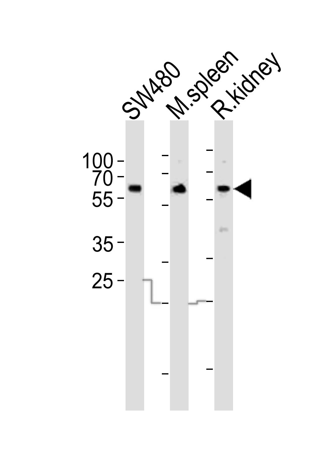 Western blot analysis of lysates from SW480 cell line mouse spleen, rat kidney tissue (from left to right), using PPP2R1B Antibody (N-term)(APR04739G). APR04739G was diluted at 1:1000 at each lane. A goat anti-rabbit IgG H&L(HRP) at 1:10000 dilution was used as the secondary antibody. Lysates at 20ug per lane. |