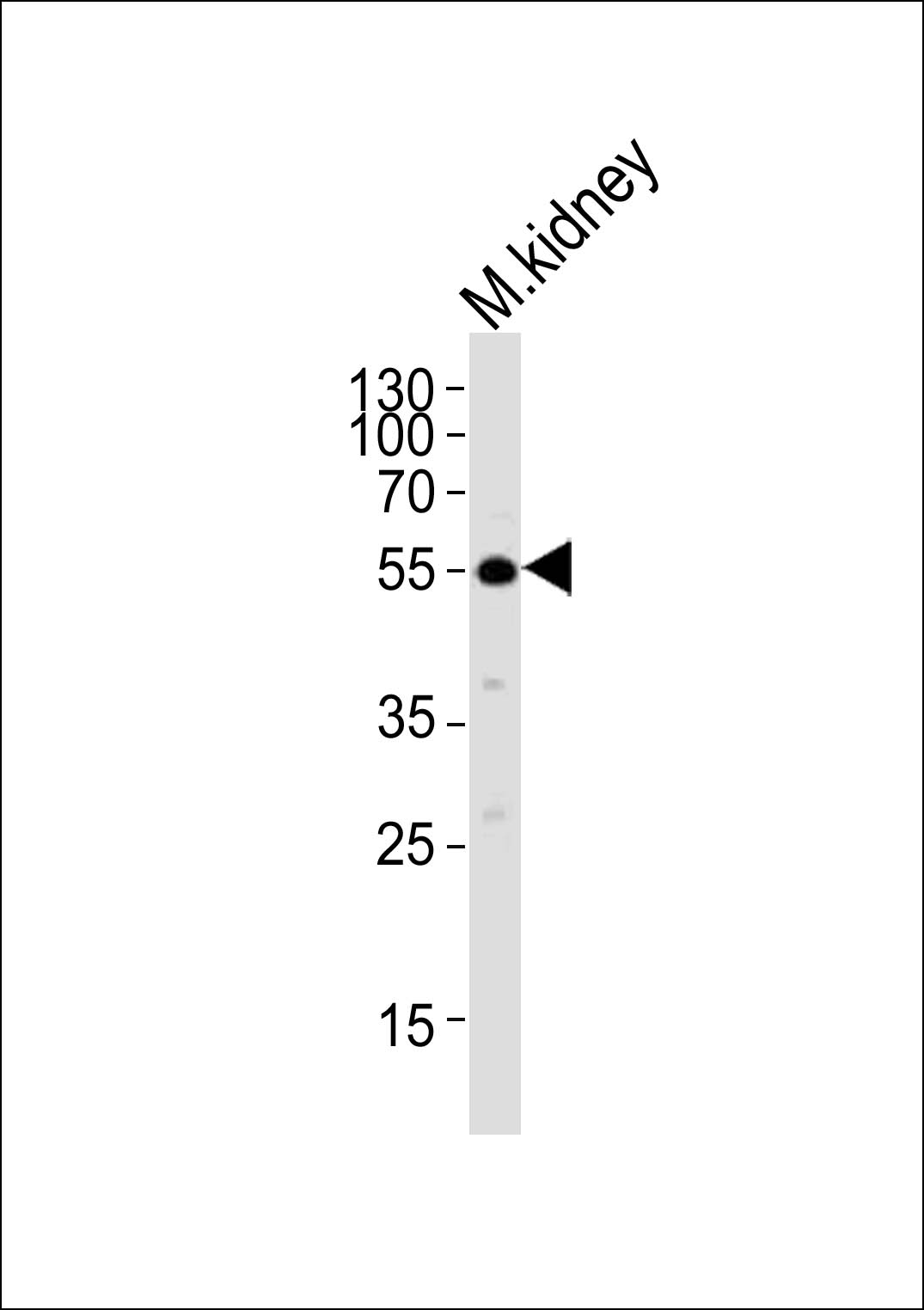 Western blot analysis of lysate from mouse kidney tissue, using NACC1 Antibody (Center)(APR04758G). APR04758G was diluted at 1:1000. A goat anti-rabbit IgG H&L(HRP) at 1:10000 dilution was used as the secondary antibody. Lysate at 20ug. |