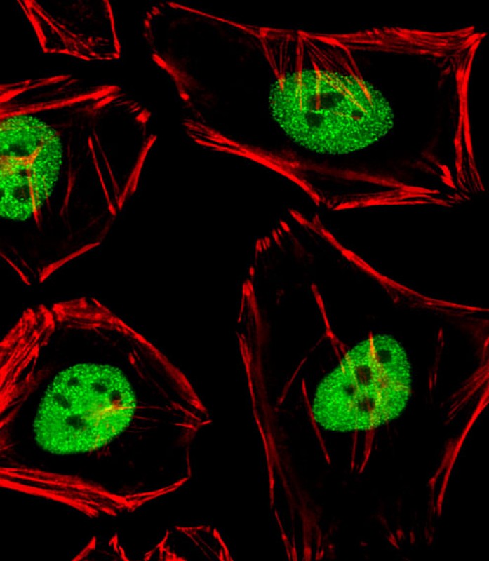 Immunofluorescent analysis of 4% paraformaldehyde-fixed, 0. 1% Triton X-100 permeabilized Hela (Human Cervical epithelial adenocarcinoma cell line) cells labeling ANAPC2 with APR04767G at 1/25 dilution, followed by Alexa Fluor 488-conjugated goat anti-rabbit IgG (1583138) secondary antibody at 1/400 dilution (green). Confocal image showing nuclear staining on Hela cell line. Cytoplasmic actin is detected with Alexa Fluor? 555 conjugated with Phalloidin (OB16636430) at 1/100 dilution (red).