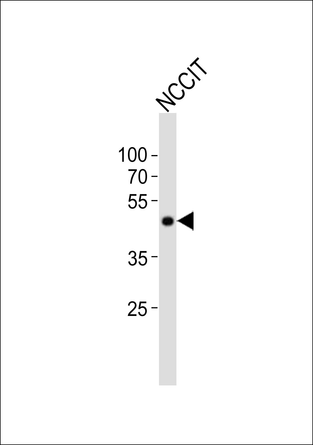 Western blot analysis of lysate from NCCIT cell line, using POU5F1 Antibody (Center)(APR04781G). APR04781G was diluted at 1:1000. A goat anti-rabbit IgG H&L(HRP) at 1:10000 dilution was used as the secondary antibody. Lysate at 20ug. |