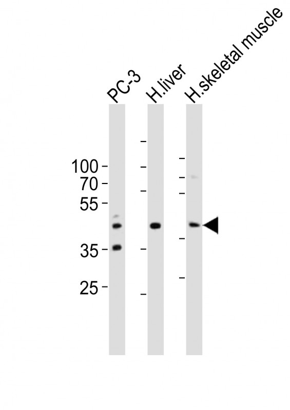 Western blot analysis of lysates from PC-3 cell line, human liver, human skeletal muscle tissue lysate(from left to right), using POC1A Antibody (C-term)(APR04795G). A goat anti-rabbit IgG H&L(HRP) at 1:10000 dilution was used as the secondary antibody. Lysates at 20ug per lane. |