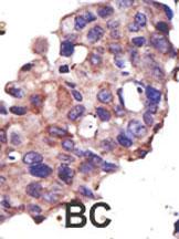 Formalin-fixed and paraffin-embedded human cancer tissue reacted with the primary antibody, which was peroxidase-conjugated to the secondary antibody, followed by DAB staining. This data demonstrates the use of this antibody for immunohistochemistry; clinical relevance has not been evaluated. BC = breast carcinoma; HC = hepatocarcinoma. |