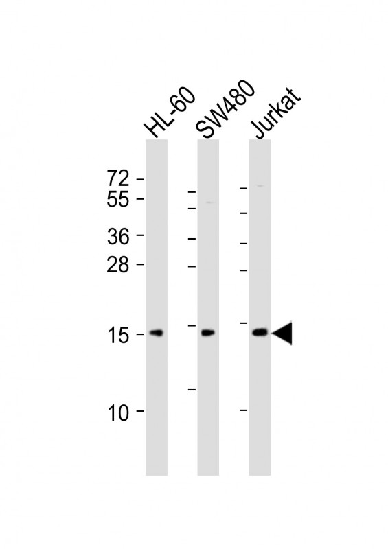 All lanes : Anti-KISS1 Antibody (C-Term) at 1:2000 dilution Lane 1: HL-60 whole cell lysates Lane 2: SW480 whole cell lysates Lane 3: Jurkat whole cell lysates Lysates/proteins at 20 μg per lane. Secondary Goat Anti-Rabbit IgG, (H+L), Peroxidase conjugated at 1/10000 dilution Predicted band size : 15 kDa Blocking/Dilution buffer: 5% NFDM/TBST. |