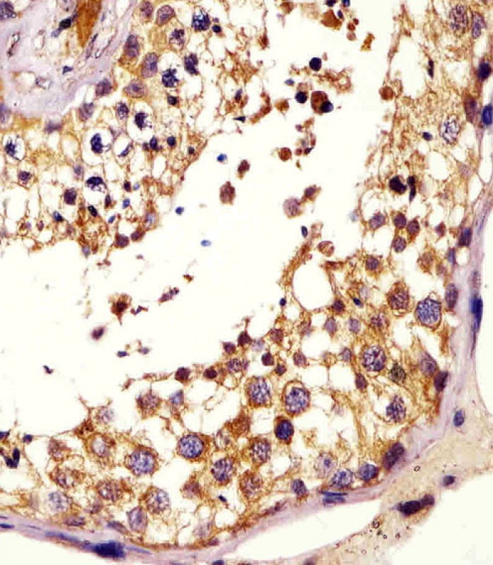 APR04836G staining KISS1 in human testis tissue sections by Immunohistochemistry (IHC-P - paraformaldehyde-fixed, paraffin-embedded sections). Tissue was fixed with formaldehyde and blocked with 3% BSA for 0. 5 hour at room temperature; antigen retrieval was by heat mediation with a citrate buffer (pH6). Samples were incubated with primary antibody (1/25) for 1 hours at 37°C. A undiluted biotinylated goat polyvalent antibody was used as the secondary antibody.