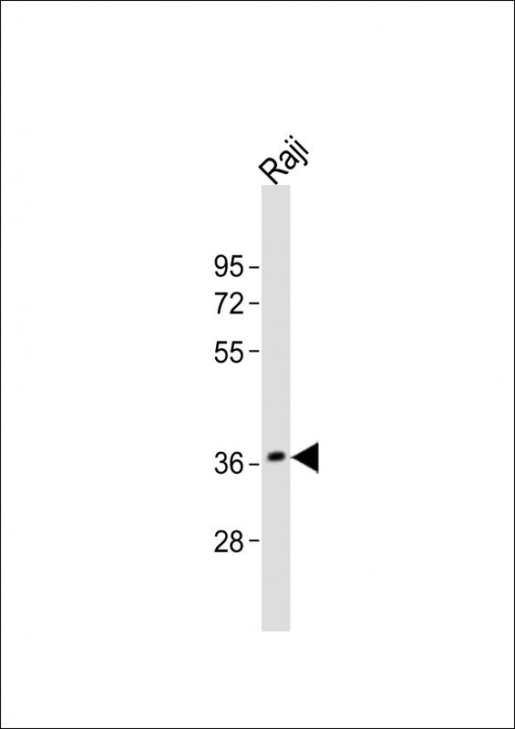 Anti-RASSF2 Antibody (N-Term)at 1:2000 dilution + Raji whole cell lysates Lysates/proteins at 20 μg per lane. Secondary Goat Anti-Rabbit IgG, (H+L), Peroxidase conjugated at 1/10000 dilution Predicted band size : 38 kDa Blocking/Dilution buffer: 5% NFDM/TBST.
