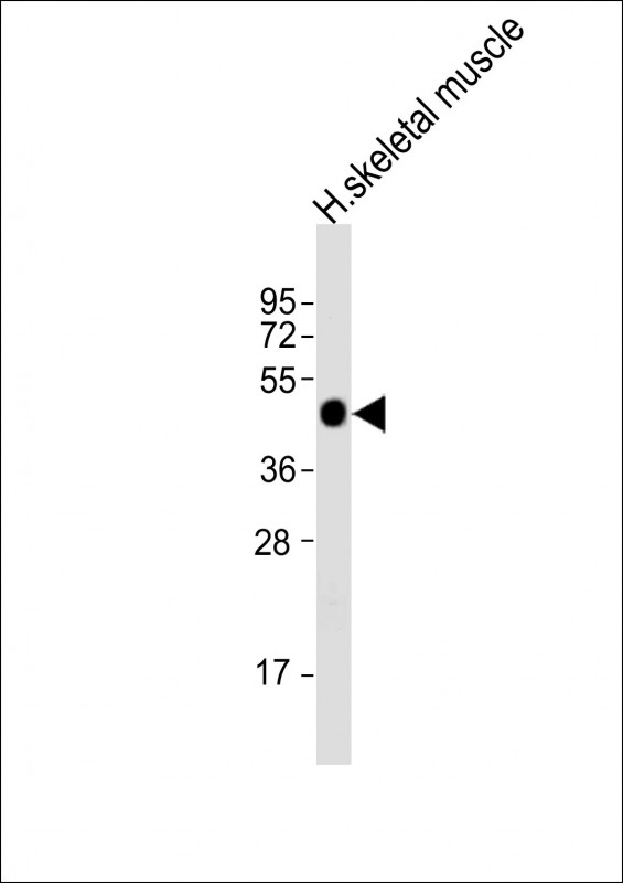Anti-AGPHD1 Antibody (N-Term)at 1:2000 dilution + human skeletal muscle lysates Lysates/proteins at 20 μg per lane. Secondary Goat Anti-Rabbit IgG, (H+L), Peroxidase conjugated at 1/10000 dilution Predicted band size : 42 kDa Blocking/Dilution buffer: 5% NFDM/TBST. |