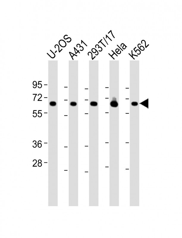 All lanes : Anti-RSL1D1 Antibody (C-Term) at 1:2000 dilution Lane 1: U-2OS whole cell lysate Lane 2: A431 whole cell lysate Lane 3: 293T/17 whole cell lysate Lane 4: Hela whole cell lysate Lane 5: K562 whole cell lysate Lysates/proteins at 20 μg per lane. Secondary Goat Anti-Rabbit IgG, (H+L), Peroxidase conjugated at 1/10000 dilution. Predicted band size : 55 kDa Blocking/Dilution buffer: 5% NFDM/TBST. |