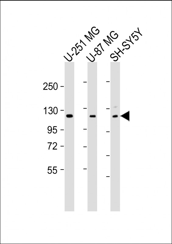 All lanes : Anti-SH3PXD2B Antibody (C-Term) at 1:2000 dilution Lane 1: U-251 MG whole cell lysate Lane 2: U-87 MG whole cell lysate Lane 3: SH-SY5Y whole cell lysate Lysates/proteins at 20 μg per lane. Secondary Goat Anti-Rabbit IgG, (H+L), Peroxidase conjugated at 1/10000 dilution. Predicted band size : 102 kDa Blocking/Dilution buffer: 5% NFDM/TBST. |
